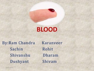 Blood is a connective tissue that functions to transport oxygen, nutrients, waste, and more throughout the body. It is composed of formed elements such as red blood cells, white blood cells, and platelets suspended in plasma. Red blood cells carry oxygen and carbon dioxide, white blood cells protect the body from infection, and platelets help the blood to clot. Blood is essential for life as it transports these critical substances, regulates pH and temperature, and protects the body from pathogens.