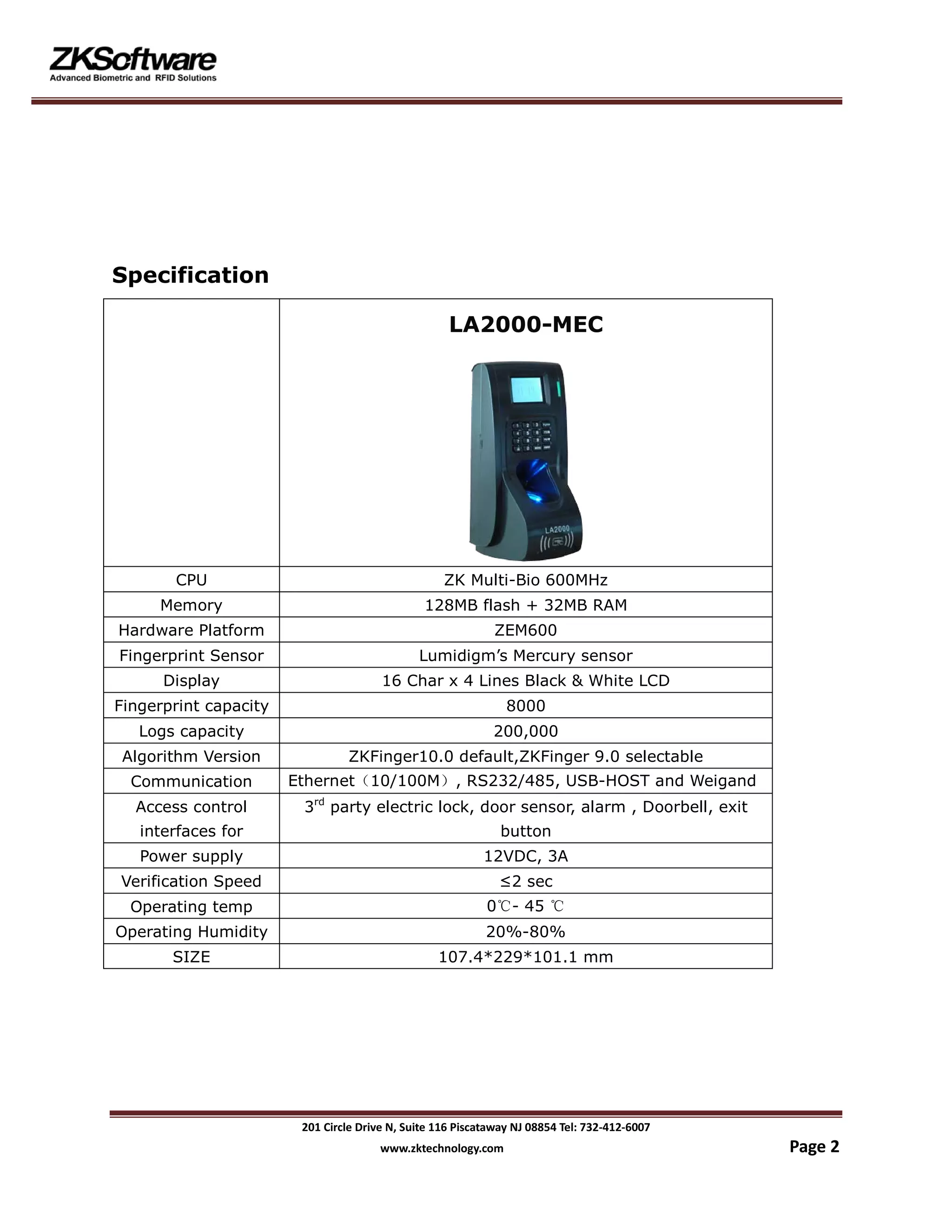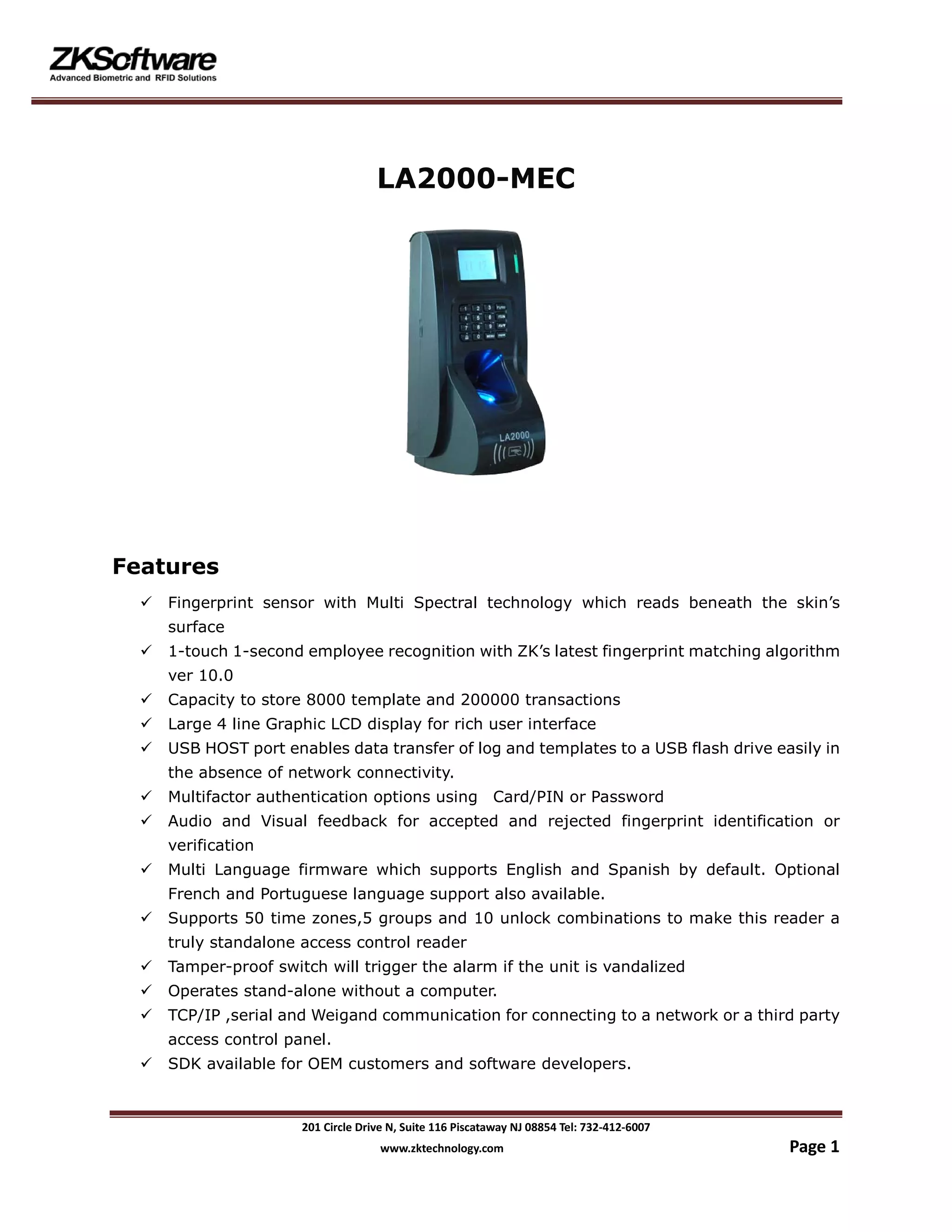 The LA2000-MEC is a fingerprint reader that can store 8000 templates and 200,000 transactions. It uses multi-spectral fingerprint sensing and 1-second employee recognition. It has communication options like Ethernet, WiFi, USB, and Wiegand protocols. The reader has a graphic LCD, audio/visual feedback, and can operate independently or connect to access control systems.