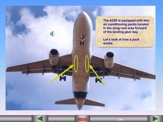 The document describes the air conditioning system on an Airbus A320, which uses two air conditioning packs to cool bleed air and distribute it to different zones of the aircraft. Hot air can be added to the zones via trim air valves to adjust the temperature. The cargo area also has a heating system that operates on similar principles to the main air conditioning system.