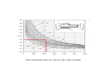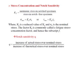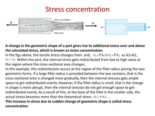 1. The document discusses stress concentration which occurs due to sudden changes in geometry like fillets, holes, notches etc. having smaller radii. It increases the actual stress beyond theoretical stress.