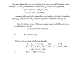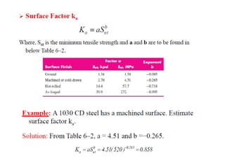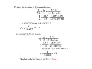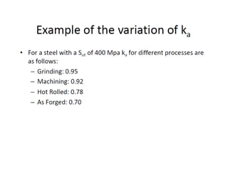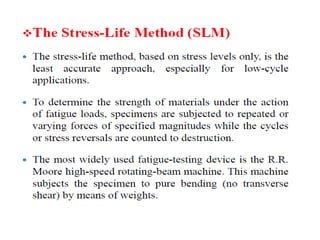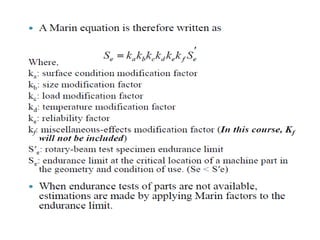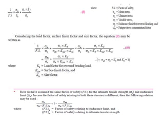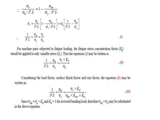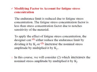 3. Methods to analyze combined steady and fluctuating stresses like Goodman, Soderberg and Gerber methods are presented. These allow evaluating equivalent stress when the component experiences mean and fluctuating stresses simultaneously.