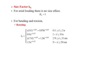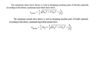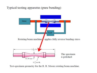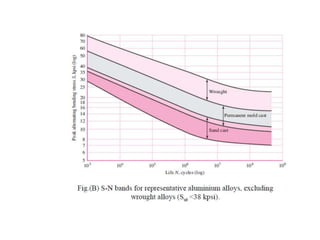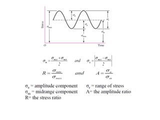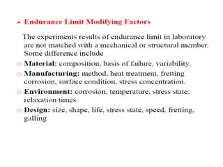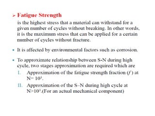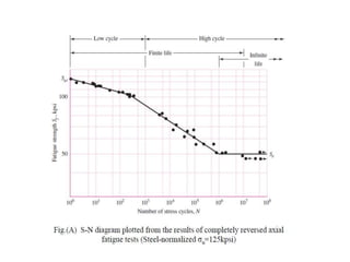 2. It also discusses fatigue failure which occurs in materials when subjected to fluctuating loads even if the stresses are below yield strength. Fatigue life of materials is represented using S-N diagrams with endurance limit as the fatigue strength for infinite life.