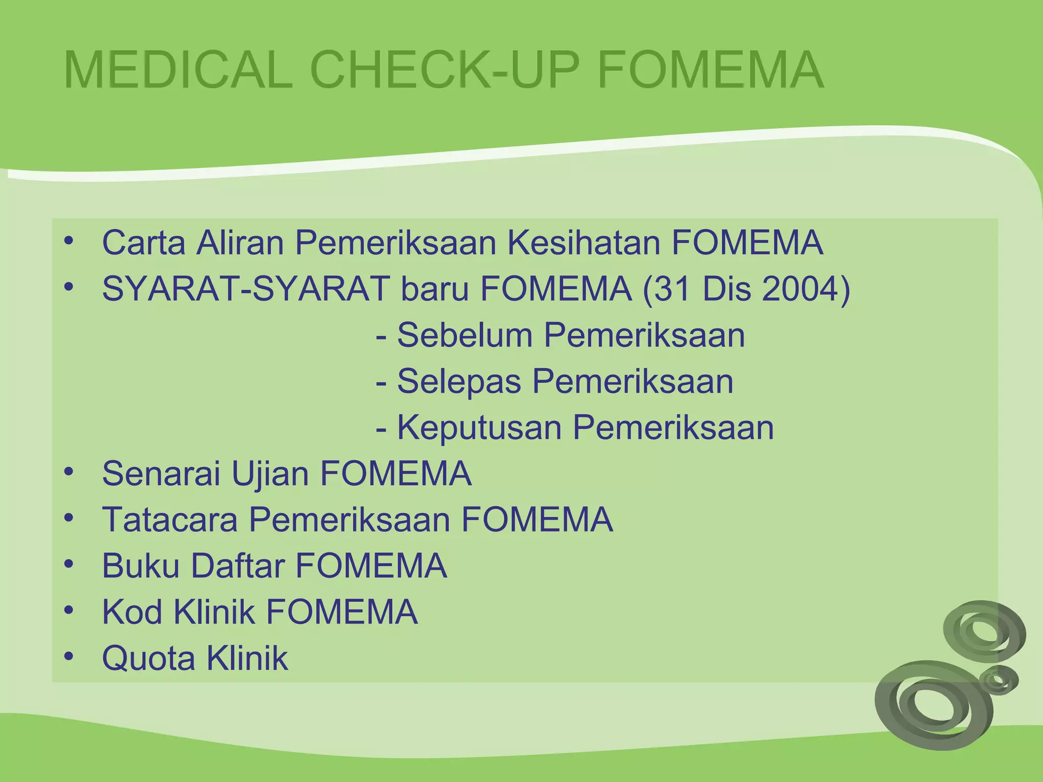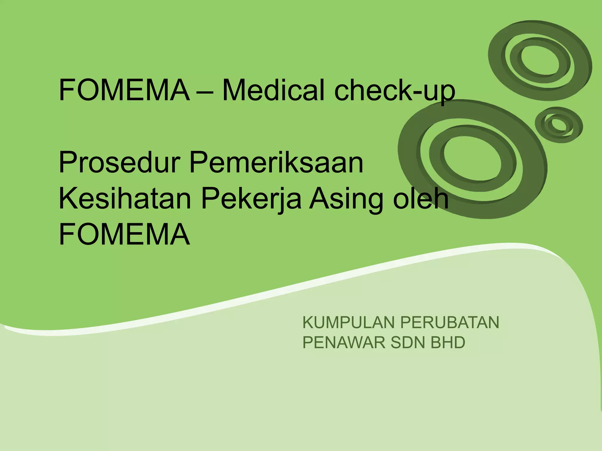 Dokumen ini menjelaskan prosedur pemeriksaan kesihatan pekerja asing oleh FOMEMA, termasuk syarat sebelum dan selepas pemeriksaan, serta tatacara pengiriman spesimen. Klinik tidak dibenarkan menggunakan agen untuk mendapatkan pesakit FOMEMA dan hanya doktor berdaftar di klinik yang boleh melakukan pemeriksaan tersebut. Semua data pekerja asing dan keputusan pemeriksaan harus direkod dan disimpan dengan baik, serta dilaporkan kepada FOMEMA dan Kementerian Kesihatan dalam waktu yang ditetapkan.