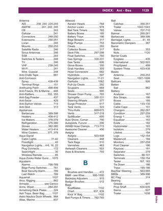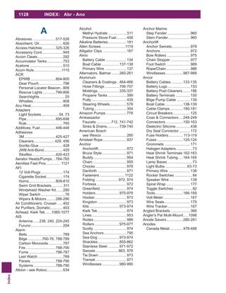 This document is an index listing various boat parts and supplies organized alphabetically from A to B. It includes entries for items like abrasives, accessories, adhesives, anchors, batteries, bilge pumps, blocks, boat covers, and more. Each entry lists relevant brands and page numbers. This index provides a high-level overview of products covered in over 1,100 pages of documentation.