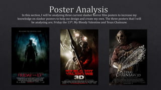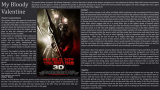 This poster analyzes the conventions used in the movie poster for "My Bloody Valentine". It follows horror movie poster conventions such as using red, black, and white colors; featuring the antagonist holding his weapon; and including the movie title, tagline, release date, and studio logos. The 3D aspect is prominently featured to attract audiences to see it in 3D. Lighting, setting, and costumes are used to create fear and suggest the film takes place in a hellish mine shaft. The poster effectively promotes the slasher film and will attract the intended horror movie audience.