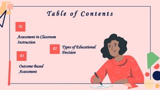 This document discusses different types of assessments used in education including placement, formative, diagnostic, and summative assessments. It also covers educational decision making using assessment results for instruction, grading, selection, placement, guidance and counseling, and administrative policy. Finally, it discusses outcome based assessment, defining student learning outcomes, sources of expected learning outcomes, and characteristics of good learning outcomes.