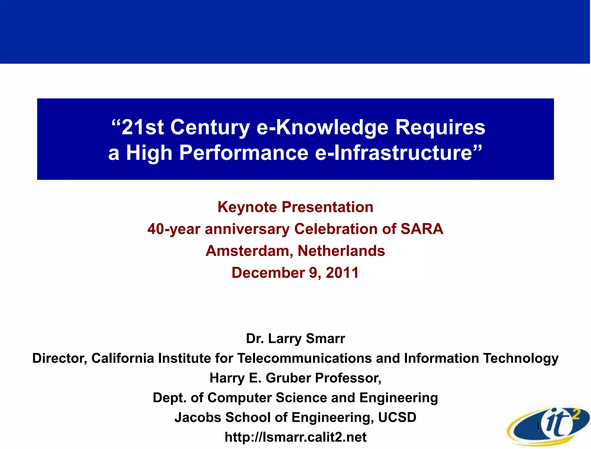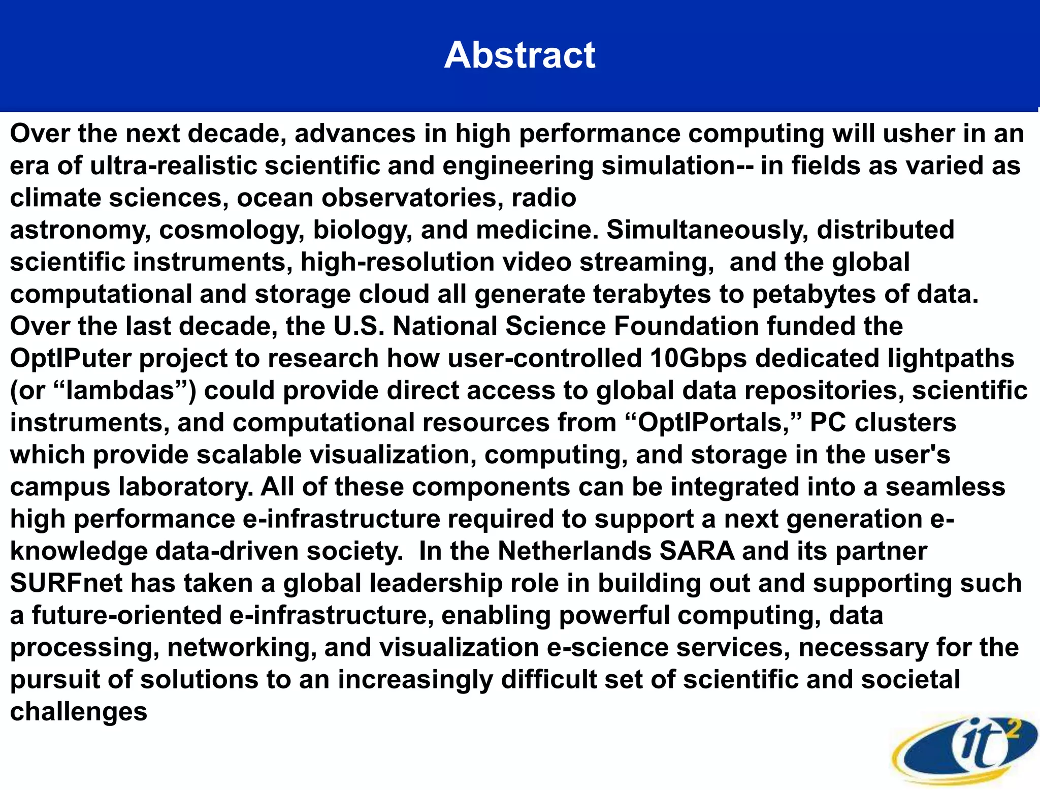 The keynote presentation by Dr. Larry Smarr discusses the role of high-performance computing and e-infrastructure in advancing scientific simulation across various fields, including biology and climate science. The Optiputer project illustrates how dedicated lightpaths can facilitate access to global data and instruments, supporting the next generation of data-driven research. In collaboration with organizations like SURFnet, efforts are underway to create high bandwidth collaboratories and enhance capabilities in computational research and visualization services.