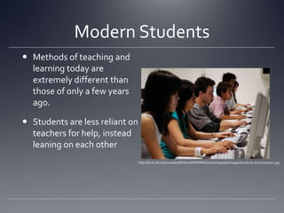 The document discusses how technology can support 21st century learning in the classroom. It notes that students learn in different ways and technology allows for multiple styles by engaging visual, auditory, kinesthetic learners. Examples given include using tools like Google Docs for collaboration, interactive whiteboards for visual lessons, and eBooks as alternatives to textbooks. Both benefits and risks of technology in education are presented, such as increased engagement but also distractions. Content filters and policies against plagiarism are suggested to mitigate risks.