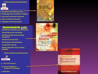 The document discusses three types of curricula: the intended curriculum set by the state, the implemented curriculum delivered by teachers, and the attained curriculum actually learned by students. It notes that the implemented curriculum has the strongest relationship to student achievement. It also discusses essential skills, knowledge and vocabulary for learning targets and content validity.