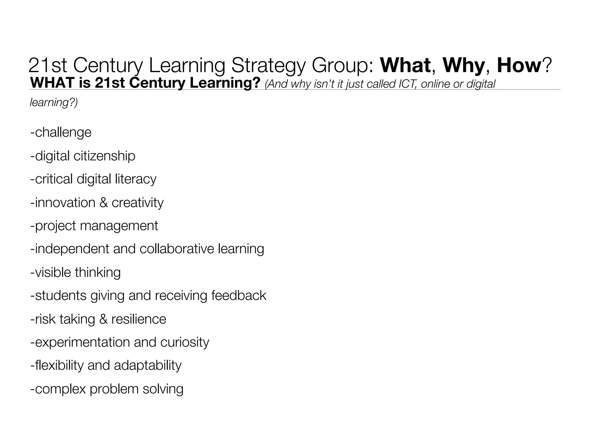 21st Century Learning refers to cultivating skills needed for future success, as the nature of work and social relationships are transformed by technology. These skills include critical thinking, communication, collaboration, innovation and adaptability. The document discusses why 21st Century Learning is important: students today are "digital natives" so education must prepare them for tomorrow's world. It also outlines goals to develop learners who can use technology creatively to solve complex problems and make informed decisions. To achieve this, the document proposes forming a strategy group to develop a shared vision and define what skills 21st Century Learners should have, and how to embed these skills into teaching practices with support for educators.