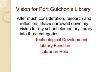 The document presents a vision for the 21st century library at Port Guichon Elementary School. It outlines plans in three key areas: technological development, library function, and librarian role. For technological development, the vision is to provide students access to computers and teach skills for finding, analyzing, and sharing information online. For library function, the goal is to make the library more accessible and a learning environment rather than just a room. For the librarian's role, the librarian will act as a facilitator of learning rather than just an authority figure by collaborating with teachers and engaging with students.