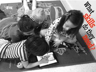The document discusses the changing definition of literacy in the 21st century and the need for collaborative classrooms. Literacy now includes skills in areas like visual literacy, digital literacy, and global literacy due to the influence of technology and online media. A collaborative classroom environment allows students to develop important competencies like critical thinking, curiosity, synthesis, and sharing knowledge through experimentation, reflection and learning from each other.