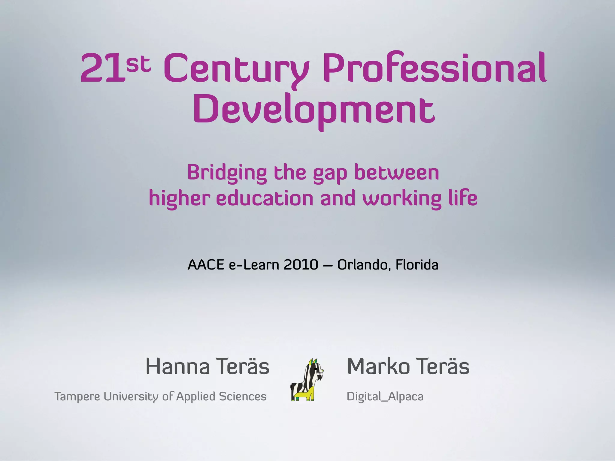The document discusses a study module implemented at Tampere University of Applied Sciences aimed at integrating 21st-century professional development skills and social media into higher education. It highlights the challenges faced by educators in teaching these skills and emphasizes the importance of mentorship from industry professionals. The project showed promising outcomes, such as increased student engagement and real-life advantages, while also identifying areas for improvement in teaching methods and the need for clearer guidance for students.