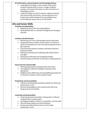 The document outlines 21st century skills that are important for success. It discusses learning and innovation skills like creativity, critical thinking, and communication. It also discusses information and technology literacy. Additionally, it outlines important life and career skills such as flexibility, self-direction, social and cross-cultural skills, productivity, accountability, and leadership. Developing these skills through various methods can help one achieve certain competency levels.