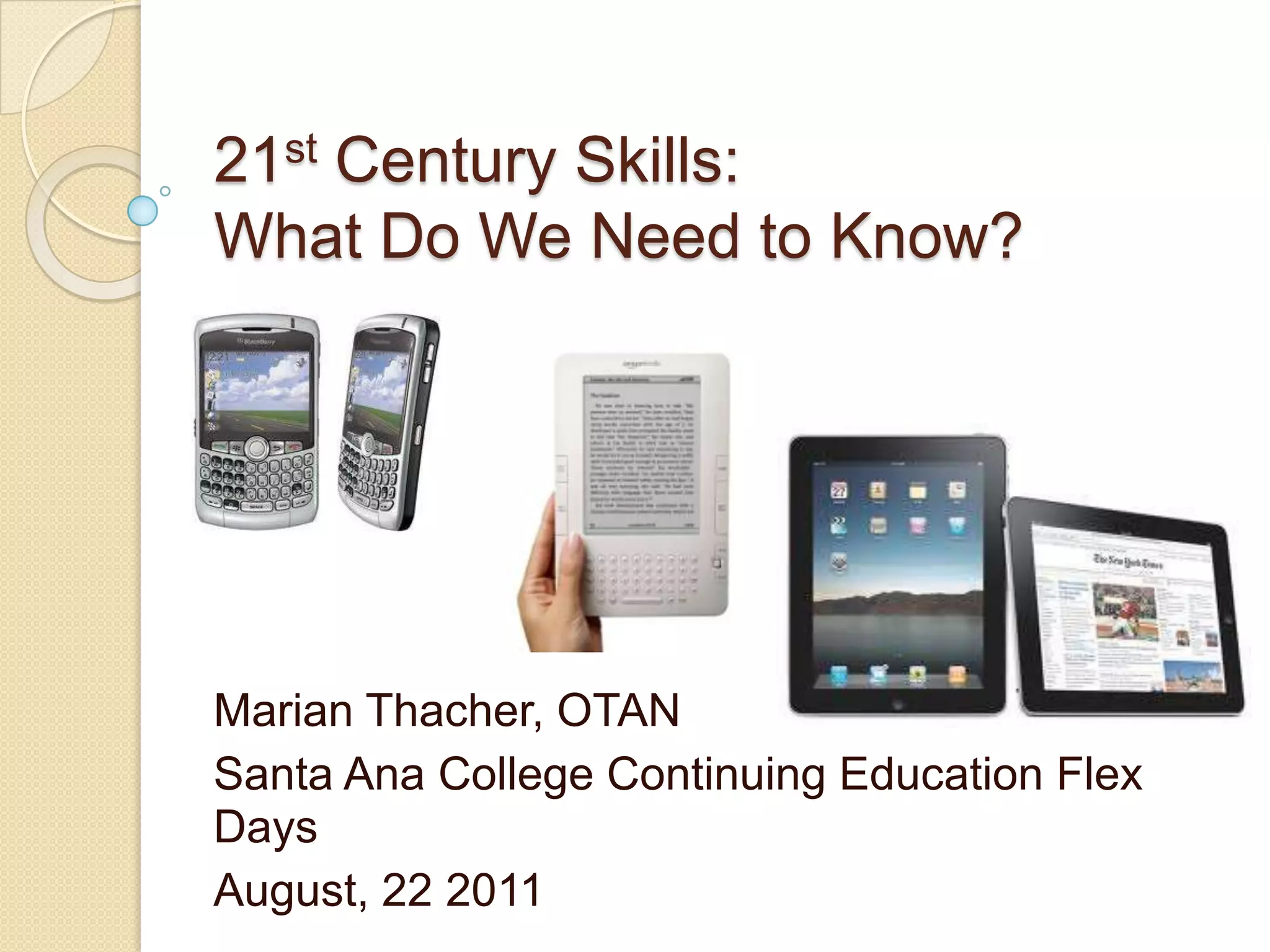 This document discusses how 21st century skills have changed and what adult learners need to know to thrive. It focuses on how technology is changing reading, communication, and education. Key points discussed include how digital textbooks and eBooks are becoming more common, how social media like Facebook and Twitter can be used for learning, and how smartphones are increasingly how people access the internet. Skills like creativity, collaboration, and digital literacy are emphasized as important for both employment and further education.