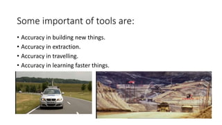 This document discusses the invention of mechanical working tools in the 21st century and how they have improved accuracy in building, extracting, traveling, and learning. These tools have increased standards of living through greater economic income by enabling better road services, skyscrapers, transportation systems, and faster learning via the internet. Mechanical systems allow people to focus on invention, perfect production, economic growth, easy access to services, and a better life with less risk compared to past tools that relied more on human labor and animals.
