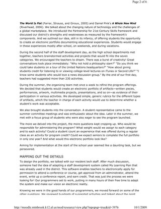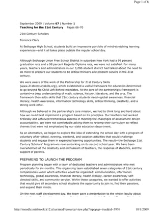The Bethpage 21st Century Scholars' Program was created to help students develop 21st century skills like critical thinking, problem solving, and global awareness through voluntary after-school activities. Over 450 students from Bethpage High School signed up for the first year of the program. It offers activities in seven categories, and students build an electronic portfolio to track their progress earning points in different areas. Examples of popular activities included trips to museums, guest speakers, literature circles, and simulations. The program was later expanded to the middle school. It provides students enriching learning experiences outside of the regular school day to prepare them for future success.