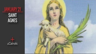 This document contains the order of service for a Mass honoring Saint Agnes. It includes prayers, readings from Scripture, and parts of the Mass liturgy. The opening and closing prayers ask God for the strength and faith of Saint Agnes, and for God's gracious acceptance of the offerings. The Gospel reading is from Mark about Jesus withdrawing from crowds to the lakeside due to their size.