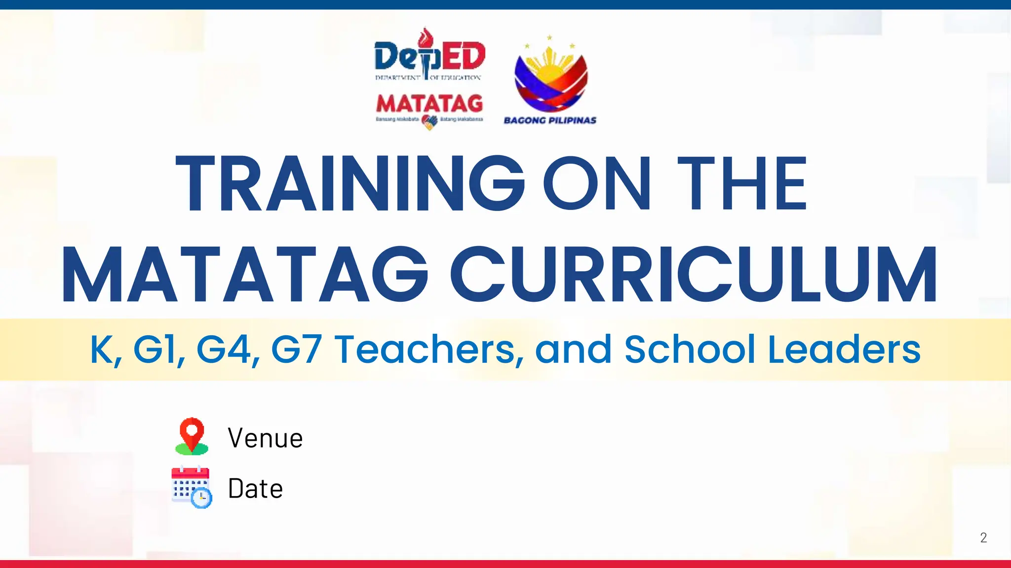 The document outlines a training program on the Matatag Curriculum aimed at teachers and school leaders, emphasizing 21st-century skills across various domains. Participants will learn to classify competencies, design assessments, and appreciate the integration of these skills into curriculum implementation. The training covers topics such as information literacy, media literacy, communication skills, and the importance of adaptability in a global context.