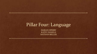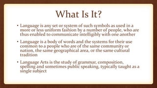 This document discusses language and its importance in education. It defines language as a system of symbols used by a group of people to communicate. Language arts teaches grammar, composition, spelling, and sometimes public speaking. Language is important for communication, relationships, and expanding knowledge of other cultures. In 21st century education, students need to learn multiple languages to compete globally. Technology like podcasts, YouTube, smart boards, blogs, and Twitter can help engage students in learning new languages through interactive games, videos, and communication with others around the world. One proposed project involves students being assigned language groups to research a country where that language is spoken and give a presentation incorporating the culture, common phrases, native food, and a video acting out a