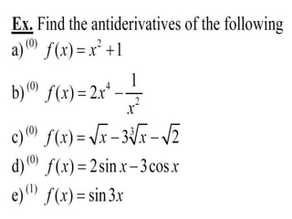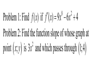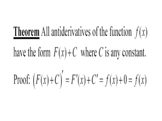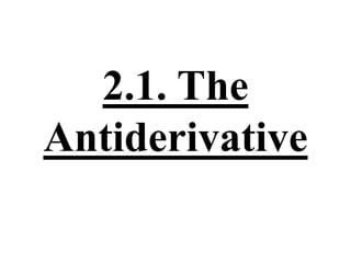 The chapter discusses the concept of the antiderivative and its applications. It provides examples of using antiderivatives to find the solutions to problems, such as calculating the area under a curve or finding the velocity given an acceleration function.