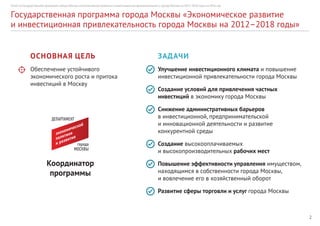 Отчет по государственной программе Москвы подводит итоги экономического развития и инвестиционной привлекательности города за 2016 год с акцентом на устойчивый рост и привлечение инвестиций. В документе представлены важные достижения, такие как рост инвестиций в основной капитал на 0,7% по сравнению с 2015 годом и улучшение условий для бизнеса через снижение налоговой нагрузки и упрощение административных процедур. Отчет подтверждает успешную реализацию программы через активную инвестиционную политику и поддержку малого бизнеса.