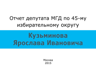 Отчет депутата Мосгордумы Ярослава Кузьминова за 2015 год описывает деятельность его команды, состоящей из 26 человек, в 45-м избирательном округе, включая работу с населением, организацию мероприятий и благоустройство городской среды. Основные достижения включают реализацию создания сквера в Б. Спасоглинищевском переулке, улучшение жилищных условий для жителей, а также благоустройство дворовых территорий и поддержку культурного наследия. Кроме того, инициатива по улучшению стандартов хостелов и решение транспортных проблем, связанных с ремонтом станции метро, также представлены в отчете.