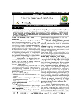 This document summarizes factors that influence employee job satisfaction and models of job satisfaction. It discusses dimensions of job satisfaction such as working conditions, wages/salaries, opportunities for advancement, and social relationships. Models explained include affect theory, dispositional theory, opponent process theory, equity theory, and Herzberg's two-factor theory. The document concludes that job satisfaction is important for employee motivation and a positive work environment enhances satisfaction.