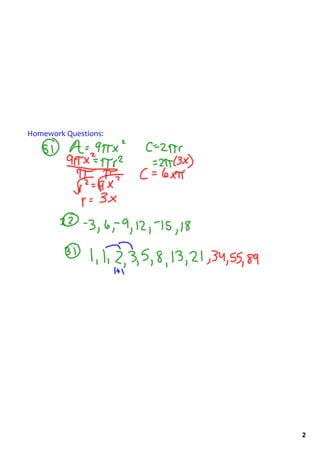 The document describes a numeric pattern where each row contains consecutive odd integers centered around 1. It asks students to conjecture the pattern and sum of terms in each row. It also provides homework questions on conditional statements, deductive reasoning, and analyzing the truth value of related conditional statements.