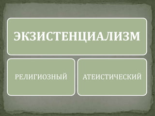 Документ охватывает философию экзистенциализма, акцентируя внимание на уникальности человеческого бытия и важности выбора в контексте свободы и существования. В нем рассматриваются идеи таких мыслителей, как Сёрен Кьеркегор, Фёдор Достоевский, Альбер Камю и другие, подчеркивающие необходимость осознания себя и взаимодействия с окружающим миром. Экзистенциализм исследует глубину человеческого опыта, включая страдания, любовь и поиск смысла жизни.