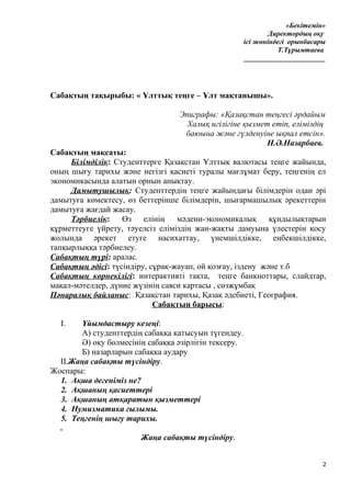 Сабақтың тақырыбы: « Ұлттық теңге – Ұлт мақтанышы».