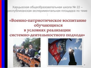 Харцызская общеобразовательная школа No 22 является республиканской экспериментальной площадкой, сосредоточенной на совершенствовании военно-патриотического воспитания учащихся в Донецкой народной республике. Основные задачи включают внедрение инновационных методов, организацию внеурочной деятельности и праздников, направленных на формирование гражданской ответственности и уважения к героическому прошлому старшего поколения. Реализация системно-деятельностного подхода осуществляется через различные воспитательные мероприятия, включая конкурсы и уроки гражданственности.