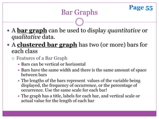 The document discusses different types of graphs including bar graphs, circle graphs, pie charts, Pareto charts, and time-series graphs. It provides examples and explains the key features and appropriate uses of each graph type. Guidelines are provided for constructing each graph correctly, with labels, titles, consistent scales, and clarity of information displayed.