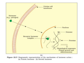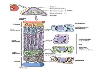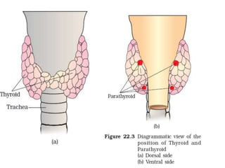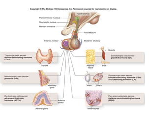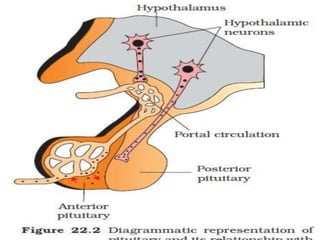 The hypothalamus produces both releasing and inhibiting hormones that regulate the pituitary gland. Releasing hormones stimulate pituitary hormone secretion while inhibiting hormones inhibit secretion. For example, GnRH stimulates gonadotropin release from the pituitary while somatostatin inhibits growth hormone release. The pituitary gland is divided into the adenohypophysis and neurohypophysis. The adenohypophysis secretes TSH, ACTH, LH, FSH, GH, prolactin and MSH which regulate other endocrine glands. The neurohypophysis stores and releases oxytocin and vasopressin from the hypothalamus.