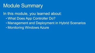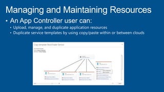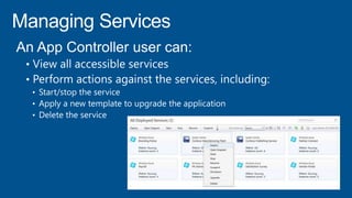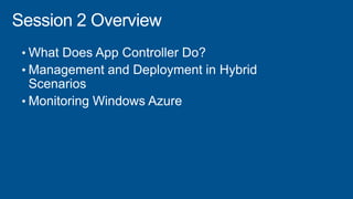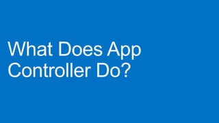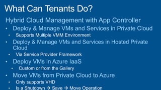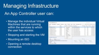 App Controller enables administration of deployed services across public, private, and hybrid clouds. It provides a familiar interface to administer services wherever they are deployed without requiring knowledge of the underlying infrastructure. App Controller integrates with Virtual Machine Manager and Windows Azure to provide a common experience for deploying, operating, and migrating applications and virtual machines between private and public clouds.