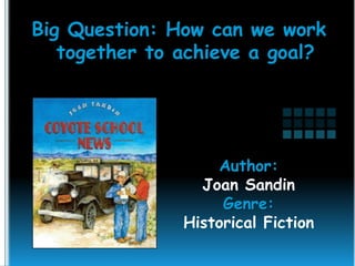 The document provides the schedule and activities for a classroom. It includes the big question for the day, which asks how we can work together to achieve a goal. The schedule lists the different activities the class will do throughout the day, including small group work, vocabulary lessons, reading assignments, and grammar lessons. It focuses on teamwork and working together to accomplish tasks.