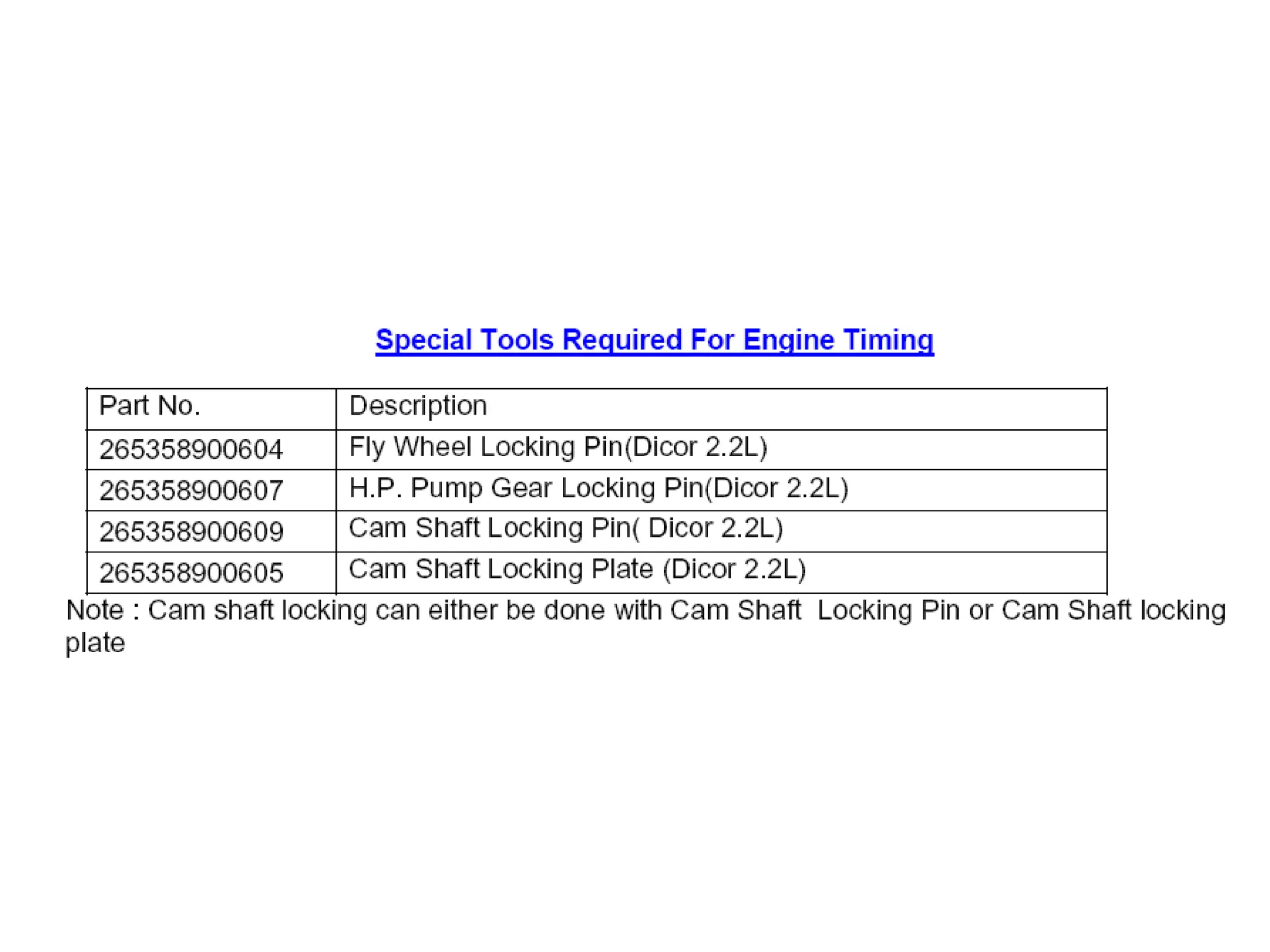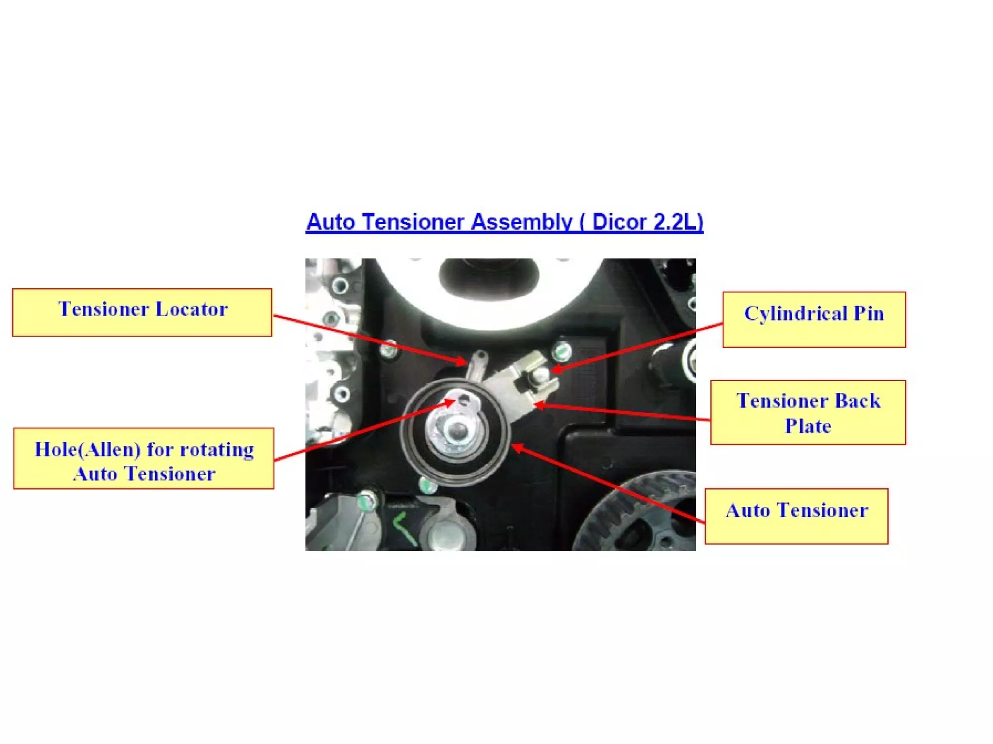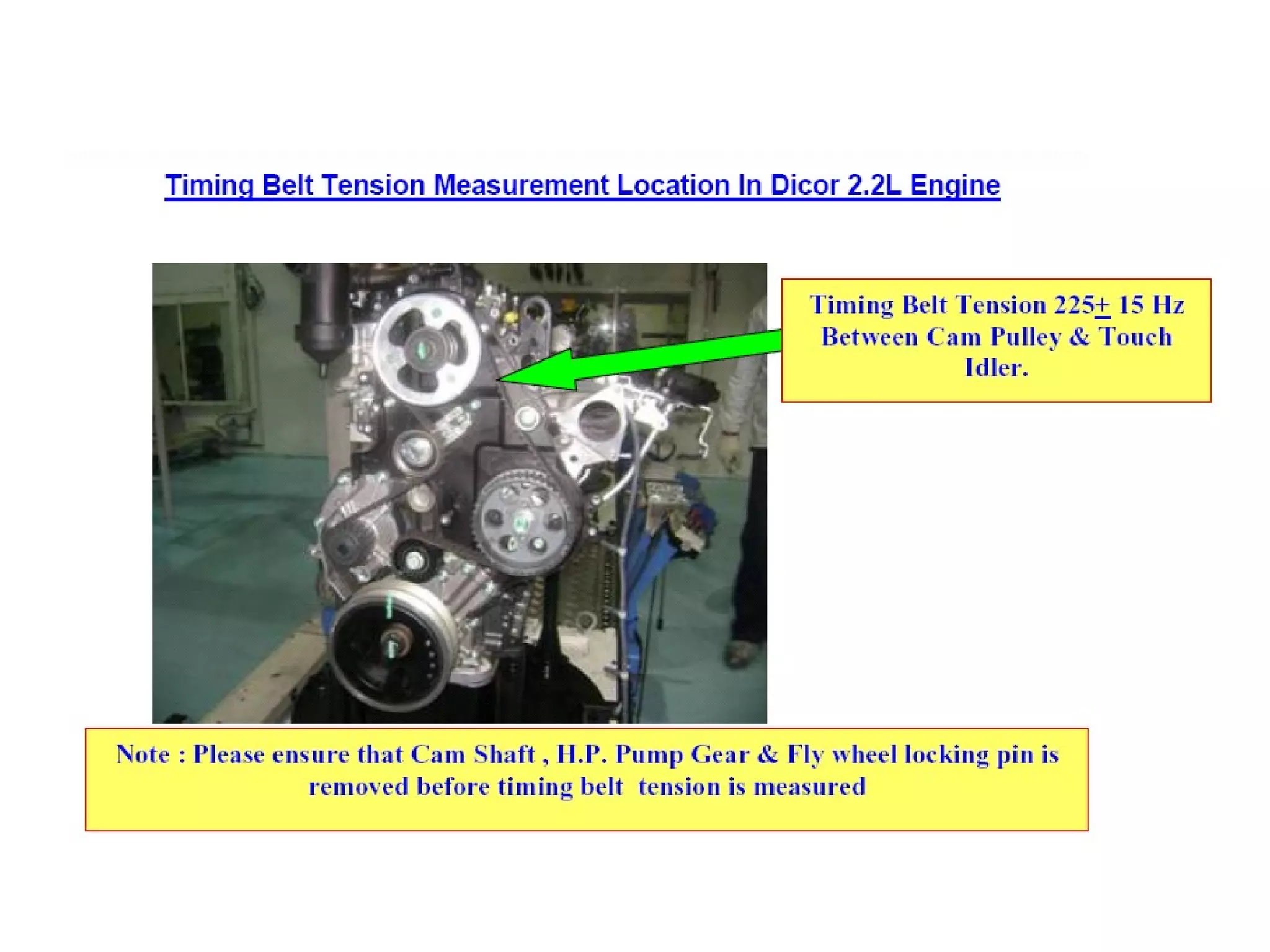 The document discusses engine timing procedures and precautions for a 2.2 engine. It states that only trained personnel should perform repairs, adherence to procedures is required, and all necessary tools must be available and used as indicated. It also notes that the timing cover should be inspected for fouling and lists two potential cases - a timing belt cutting due to misalignment, and auxiliary belt failure causing timing disturbance.