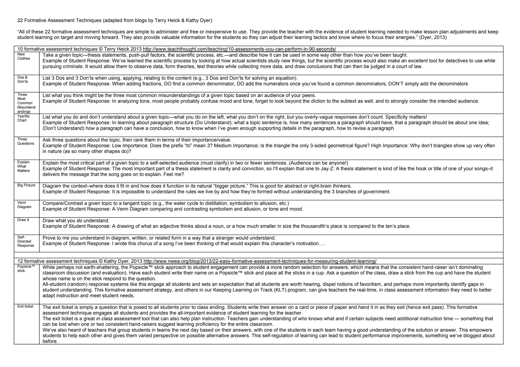 The document discusses 22 formative assessment techniques that teachers can use to evaluate student learning in the classroom. The techniques are simple to administer and provide teachers with evidence of student understanding to help adjust lesson plans. They also help students understand where they need to focus their efforts. Some of the techniques discussed include using popsicle sticks to call on random students, exit tickets where students submit answers before leaving class, using whiteboards for students to show answers, and think-pair-share activities.