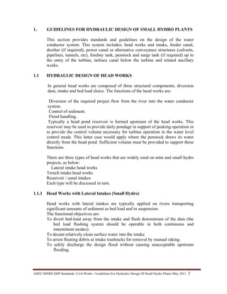 This document provides guidelines for the hydraulic design of small hydro power plants, including the design of head works and intake structures. It discusses three main types of head works: lateral intake, trench intake, and reservoir/canal intakes. For lateral intake head works, guidelines are provided on site selection, determining key elevations, layout, sizing sediment flushing gates, sizing intake trash racks, and designing diversion structures and spillways. References for further information on lateral intake and diversion weir design are also included. The guidelines aim to optimize hydraulic performance while balancing other practical constraints. Hydraulic model studies are recommended for important projects or unusual sites.