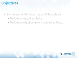 The document outlines the objectives and processes for installing and migrating the Necto software, including prerequisites, server architecture, and detailed installation steps. It emphasizes the requirements such as specific Windows Server versions, SQL Server configurations, and necessary permissions for installation. Post-installation configurations and validation steps are also provided to ensure proper setup and functionality of Necto.