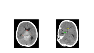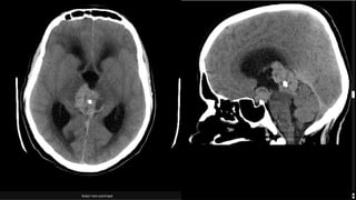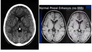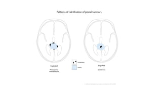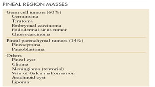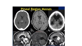 The document discusses pineal region masses, outlining the anatomy, imaging modalities, and types of tumors such as germ cell tumors, pineocytomas, and pineoblastomas. It highlights that germ cell tumors are the most common type found in children, with distinct imaging characteristics, while pineal cysts are frequently encountered as incidental findings. Additionally, it provides details on the clinical presentation, imaging findings on CT and MRI, and relevant references for further reading.