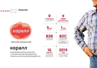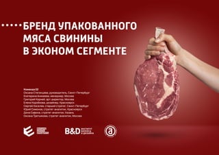 Документ описывает стратегию разработки бренда упакованного мяса свинины в эконом сегменте с фокусом на высокое качество по доступной цене. Основные задачи проекта включают создание бренд-платформы и визуального решения, направленного на удовлетворение потребностей целевой аудитории, что связано с ростом спроса на свинину. Упаковка и предлагаемый ассортимент продукции должны поддерживать имидж натуральности и свежести продукта для потребителей, ориентированных на семейные ценности.