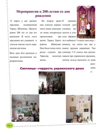 Документ посвящен 200-летию Тараса Шевченко, который является важной фигурой для украинского народа и символом национального единства. В нем описаны мероприятия, организованные для празднования этой даты, включая конкурсы чтецов и викторины, а также акции, посвященные здоровью и безопасности. Также упоминается участие учащихся в фестивале циркового искусства, что подчеркивает активность и творческий дух участников.