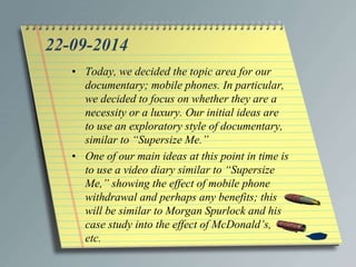 Thomas Yeomans recorded in his diary that on September 22nd, 2014, he and his group decided to make a documentary about whether mobile phones are a necessity or luxury. They planned to take an exploratory approach similar to "Supersize Me" by using a video diary to document the effects of withdrawing from mobile phone use. At this point, Thomas and the group were nervous about the production, particularly editing which none were highly skilled in, and Thomas was also concerned about his ability to effectively organize and conduct the filming.