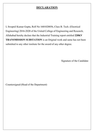 This document is an industrial training report submitted by Swapnil Kumar Gupta for their Bachelor of Technology degree in Electrical Engineering. The report provides an overview of Swapnil's 2-week industrial training at the 220kV substation in Rewa Road, Allahabad, which is operated by Uttar Pradesh Power Transmission Corporation Limited. The report includes details about the equipment and processes at the substation, as well as declarations, acknowledgements, and chapters covering topics like the selection of substation sites, common equipment used in 220kV substations, and descriptions of the transformer and other components.