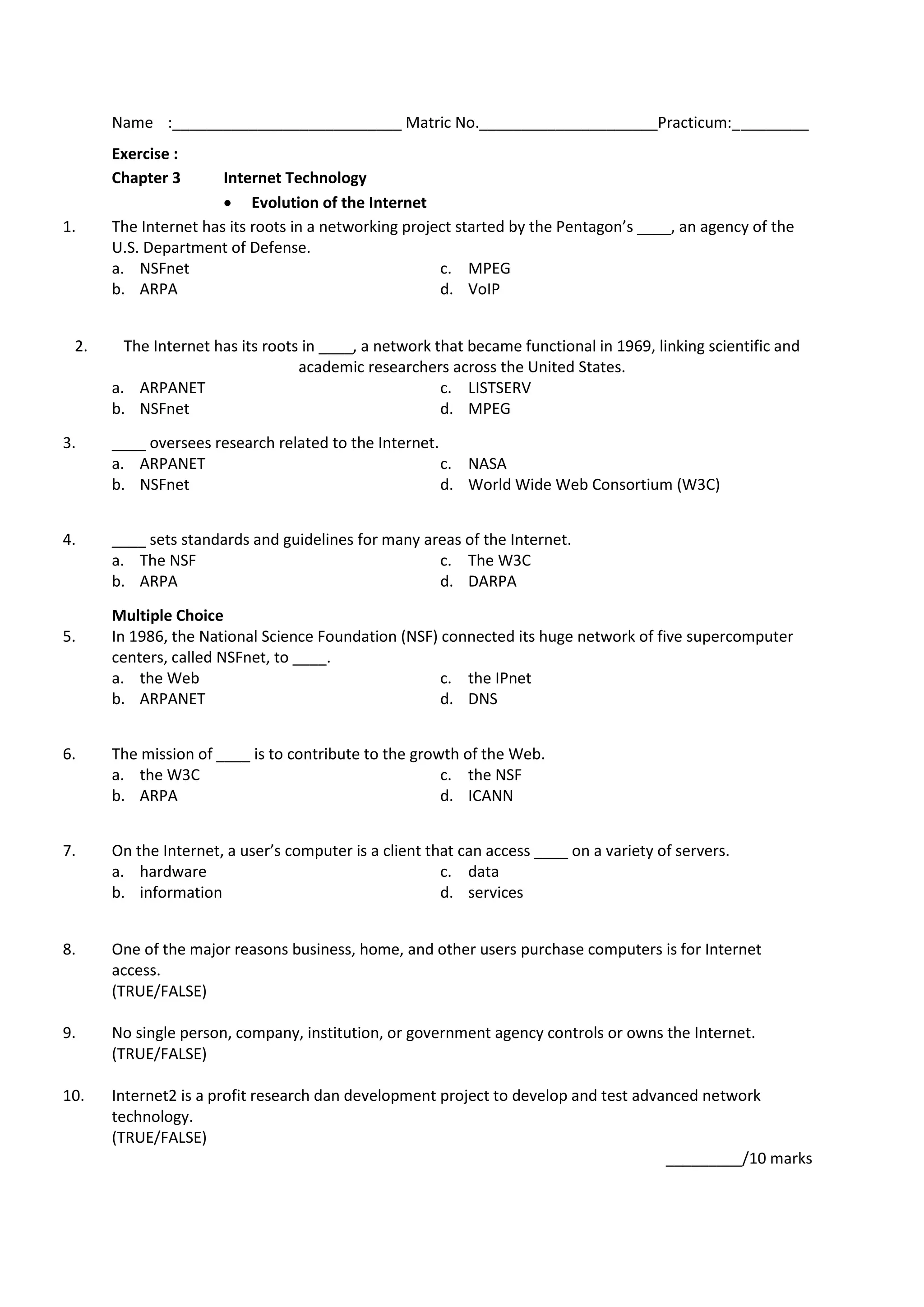 The document is a practice exercise on the evolution of the Internet. It contains 10 multiple choice questions testing knowledge of key events and organizations involved in the development of the Internet. These include the origins of ARPANET, the role of NSFnet, standards bodies like W3C, and concepts like how users can access data and services on the Internet through client-server interactions. It also covers facts about how no single entity owns the Internet and that Internet2 was a non-profit research project rather than commercial venture.