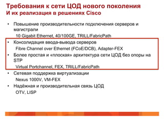 Документ описывает требования и решения для сетевой инфраструктуры нового поколения для центров обработки данных (ЦОД) на базе технологий Cisco, включая консолидацию трафика и поддержку виртуализации. Основное внимание уделяется использованию Fibre Channel over Ethernet (FCoE) и различным аспектам унифицированной сети, включая преимущества использования Ethernet и Fiber Channel вместе, а также решения для повышения производительности и надежности сети. Также рассматриваются новые технологии, такие как Cisco FabricPath, для оптимизации управления и масштабируемости сетевой архитектуры.