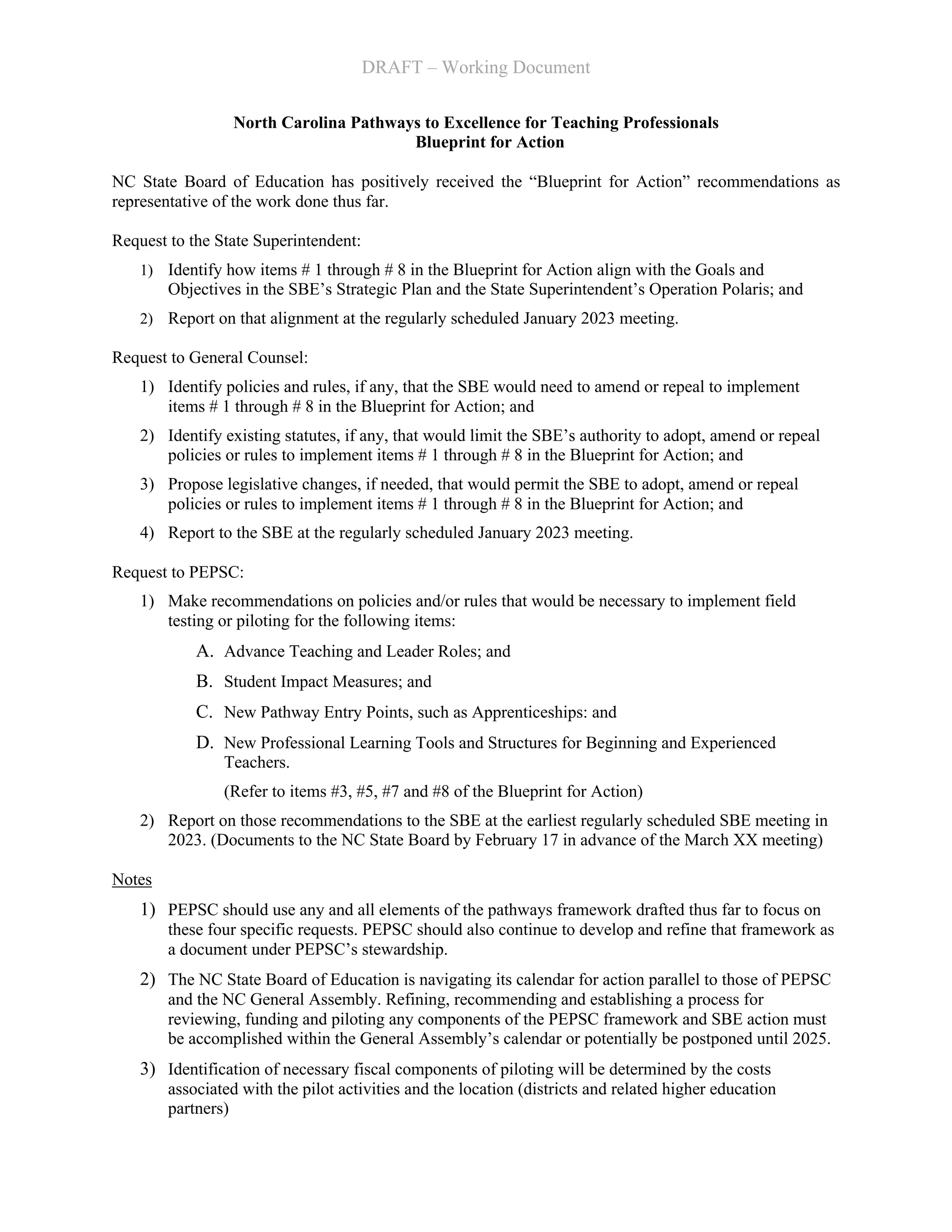 The NC State Board of Education has received recommendations in the "Blueprint for Action" document. It requests that the State Superintendent identify how the recommendations align with strategic goals and plans, and report back in January 2023. It also requests that the General Counsel identify any policies or statutes that would need updating to implement the recommendations, and propose any necessary legislative changes. Finally, it requests that the PEPSC make recommendations on piloting aspects of the blueprint related to teaching roles, student impact measures, new entry points, and professional learning, and report back in February 2023. The document provides scaffolding to guide PEPSC's recommendations.