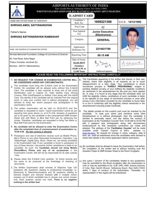 1) The document is an admit card for a candidate named Shrivas Amol Satyanarayan for a written examination being conducted by Airports Authority of India on 26th April 2015.