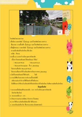 นิ้มประยูร เบอรโทรศัพท 084-1039714 ชือมารดา นางเอืองฟา นิมประยูร เบอรโทรศัพท 084-1039714 ่ ้ ้ 3.ชื่อผูปกครอง นายอาทิตย นิ้มประยูร เบอรโทรศัพท 084-1039714 ความเกี่ยวพันธกับนักเรียน เปน บิดา อาชีพ คาขาย 4.จบชัน ม.3 มาจากโรงเรียน ยุพราชวิทยาลัย ้ เนือหา/วิชาคอมพิวเตอร ที่เคยเรียนมา ไดแก ้ / Microsoft Word / Microsoft Excel / Microsoft Powerpoint อื่น ๆ photoshop โปรแกรมทีถนัด Microsoft Word ่ โปรแกรมที่อยากใหโรงเรียนจัดการเรียนการสอน photoshop 5. มีเครืองคอมพิวเตอรใชสวนตัว ่ ไมมี 6. ความใฝฝนในอนาคต การทํางานเบืองหลังทีวี ้ คติธรรมประจําใจ จงใชชีวิตอยางที่ใจตองการ สิ่งที่ตองการใหทางโรงเรียนจัดใหกับนักเรียน เขาใจนักเรียน รับฟงความคิดเห็นนักเรียน ขอมูลเพิ่มเติม 7. คะแนนเฉลี่ยมัธยมศึกษาตอนตน 3.01 จากโรงเรียน ยุพราชวิทยาลัย จังหวัด เชียงใหม 8. คะแนนเฉลี่ย ม.5 3.53 9. ทักษะ/ความสามารถพิเศษ ทําอาหาร รองเพลง 10. การไดรับรางวัลเกียรติบัตร(ชื่อ-ไดรบจาก) - ั 11. อยากเรียนตอดานใด สอสารมวลชน (นิเทศศาสตร) ่ื